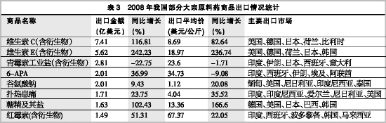 由于原材料价格、劳动力成本和能源价格上涨、人民币升值及供应预期偏紧等多重因素共同作用,2008年上半年,西药类商品出口价格大幅上涨。奥运会后,随着订单减少,库存增加,部分企业为加快资金周转,降价出售,致使全年出口价格呈前高后低的走势。目前,供求平衡的产品如维生素C、肝素钠等价格变化不大,走势平稳。而青霉素工业盐、6-APA等供过于求的产品价格下降较大,部分品种出口价格接近成本线,且成交清淡。