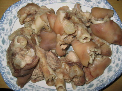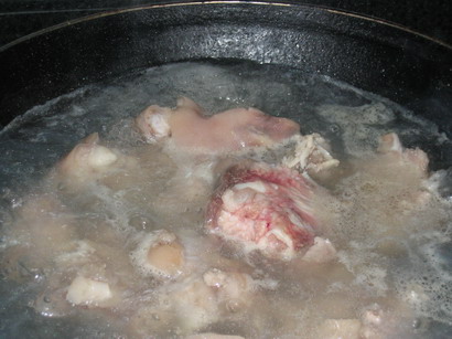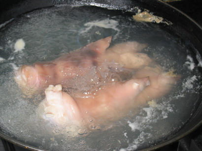 2、大约半小时后,将猪手从沸水中捞出,此时的手感已颇富弹性。这时,将猪手砍剁成块,同时再烧一锅白水。