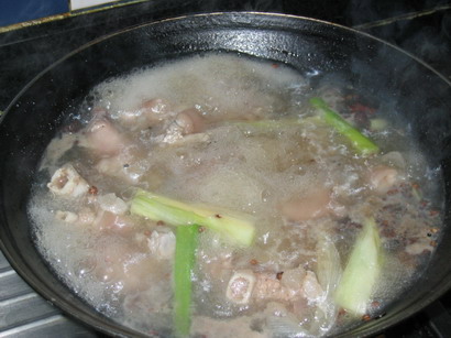 - 3、 锅内水已烧开将已成块状的猪手丢入锅内,继续烧煮,以去除血水。此时需要加入生姜片,葱段,八角,花椒,绍酒,少量的味精与盐,目的仍然是去除猪手的寒气与腥臭。