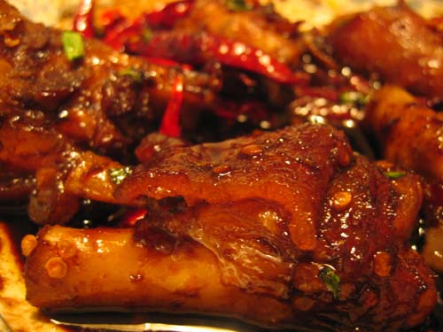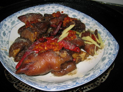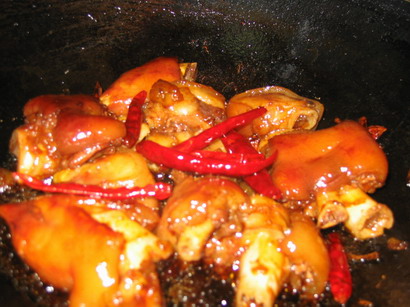 随后急火烧热新油,以姜丝葱花儿煸炒出香味儿,下入煎炸过的猪手块,然后加入冰糖,绍酒,味精,盐,红辣椒,八角,香叶,少许的酱油煸炒片刻,加入适量的清水,使材料刚刚没及猪手,然后文火靠汁儿。